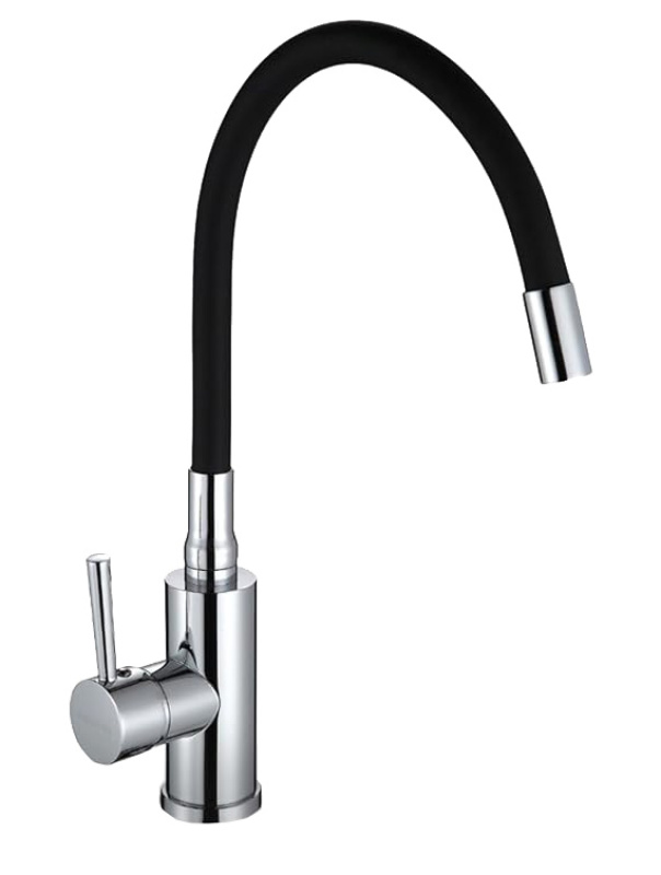 Misturador monocomando de cozinha com mangueira flexível. Acabamento aço escovado com bica black matte.
